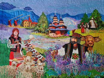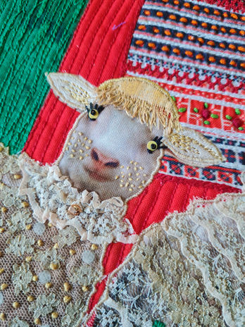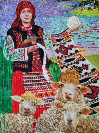 Техтильний арт: текстильний колаж, вишивка машинна, ручна вишивка, друк на тканині, бісер. Розмір 60х80 см.